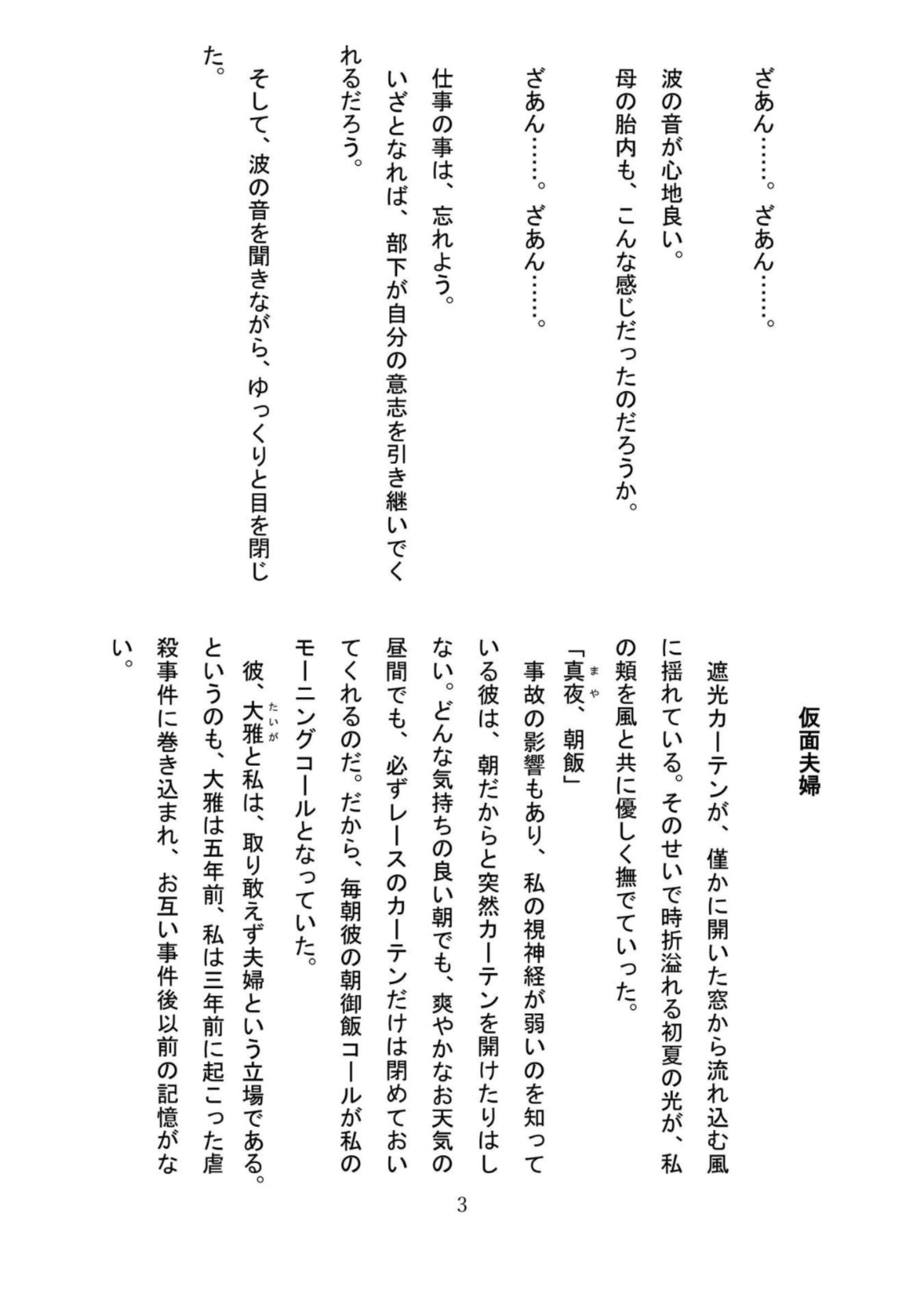 毒ガスによる二度の虐殺事件が起きた。それぞれの事件で唯一生き残った真夜と大雅は、事件の真相を見つけるための囮として、仮の夫婦生活を送ることになる。最初で最後の推理ミステリー。